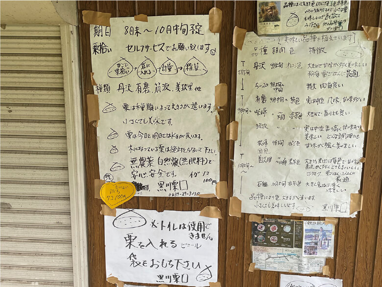 食べてくださいと言わんばかりに、こんな感じで栗が落ちています。小屋の前に栗の説明やルールが貼ってあります。栗を入れる袋は持参だったのですね。持っていきませんでしたが、ビニールに入れてくれました。