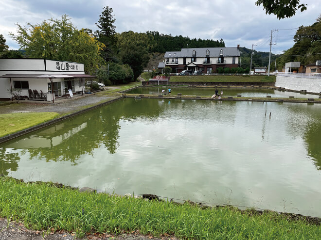 亀山ダムのすぐそばにある釣堀。左にある建物が釣堀の受付で、正面にあるペンションかめやま園が経営している。写真の2面はいずれもコイ池だが、ペンションの裏手にはもう一面ヘラブナ池がある。ブラックバスで有名な亀山湖ではコイもヘラブナも釣れるが、やはり自然の中で釣りをするのは難易度が高く、時間も準備も必要。子ども連れの方はもちろん、ちょっと気軽に釣り遊びが楽しめる広々した釣堀です。