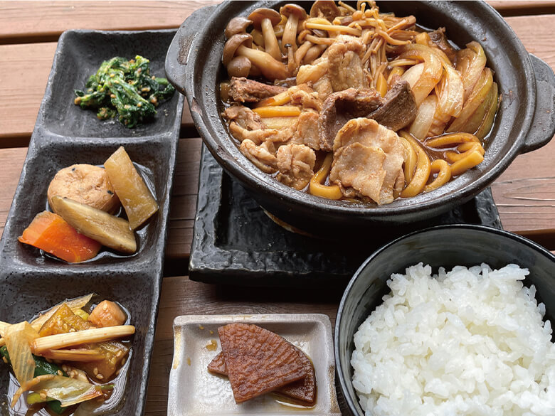 敷地内の源泉からわき出る炭酸水素塩泉は、この千葉中央部には多く見られる茶褐色の黒湯、美人の湯として知られています。日中は上の写真の岩風呂と露天風呂が日によって男女入れ替わり、日帰り入浴700円、ランチ利用なら無料で楽しめます。そのほか貸し切り専用の檜風呂も。さらに嵯峨和の魅力は料理にあります。豚と野生のイノシシのいとこ鍋、ヤマメやアユなどの川魚料理やおいしい蕎麦。席は亀山湖を見下ろし、テラス席もあります。料理を待つ間にささっとお風呂に入っても良し、旅行の気分を満喫できるお店です。