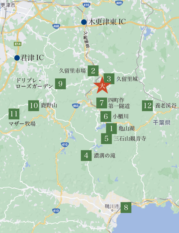 千葉・房総半島南部は低い山々が連なる独特の風景。東山魁夷が描いたことで有名な鹿野山の見晴らしや養老渓谷など静かに景色を楽しむも良し。足を伸ばして鴨川シーワールドやマザー牧場まで出かけても良し。久留里にはお城と資料館、名水と酒造メーカーがあり、おいしい飲食店も豊富。