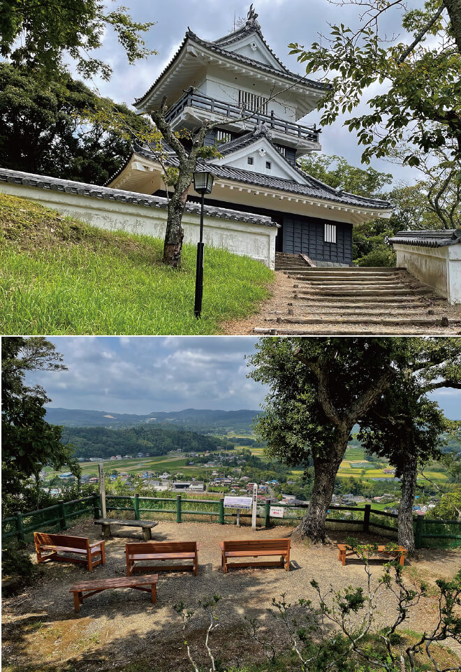 写真上は明治に解体され昭和53年に再建された天守閣。天守に向かう途中に資料館と見晴らしの良い展望所があります(写真下)。展望所といっても元は曲輪で、北条氏との古戦場を見下ろす貴重な眺めは山城ならではのもの。また、正徳の治で有名な新井白石は久留里藩の出身で銅像があります。