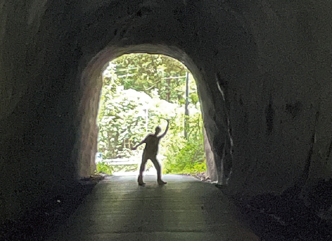 よまちさくだいいちすいどう。隧道とはトンネルのこと。なんと日本で2番目に古い現役国道トンネル。1902年に土留め工事をせず素掘りされたもので、内側にモルタルを吹き付けただけですが、国道410号465号重複指定された道路だそうです。声が響き、目が慣れない間は特に不思議な空間の感覚があります。暗いのでシャッタースピードが遅く面白い写真が撮れるでしょう。この写真は私が携帯で撮った作品で「手を振る地底人」。近いし行く価値あり。ちなみに千葉は素掘り隧道王国で、その数なんと日本で2番目。