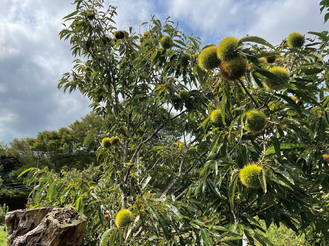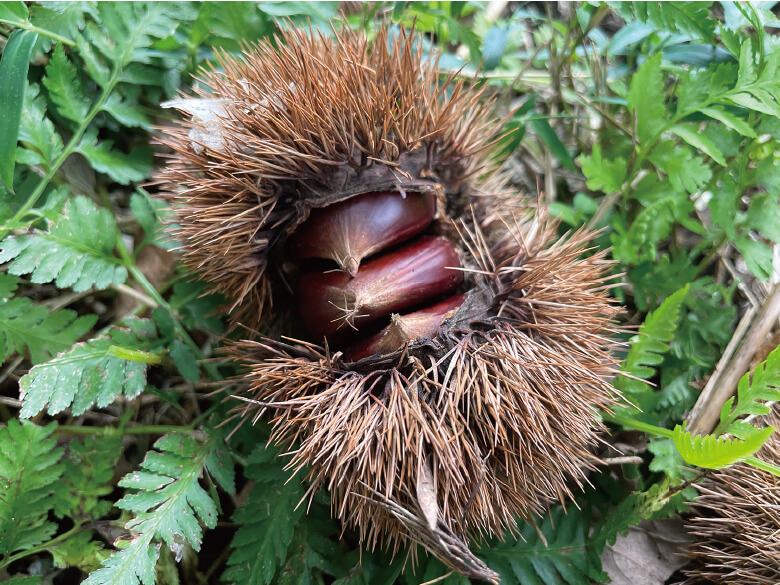 8月末~10月初旬に栗拾いが楽しめます。栗拾いという言葉の通り、木になっている栗をとるのではなく、落ちている栗を拾います。この辺りでは栗の木も多いのですが、観光客が栗拾いができる場所はあまりありません。久しぶりに栗拾いをしましたが、煮ただけの栗は思いのほか美味しかったです。