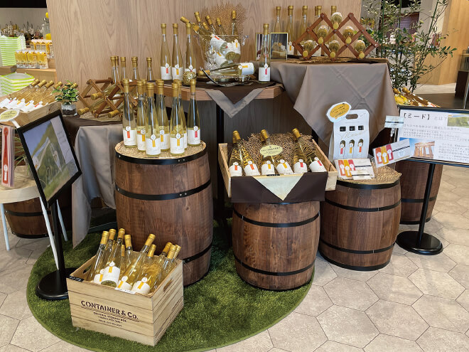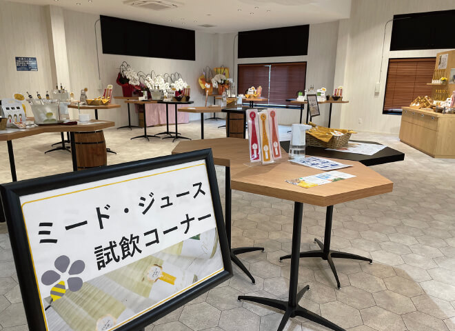 ハチミツのお酒ミードと、はちみつレモンの試飲コーナー。あまり聞き慣れないお酒の名前ですが、14000年以上前に人類が出会った「最古の酒」といわれて、ハネムーンという言葉の語源に蜂蜜酒があったという説もあるようです。