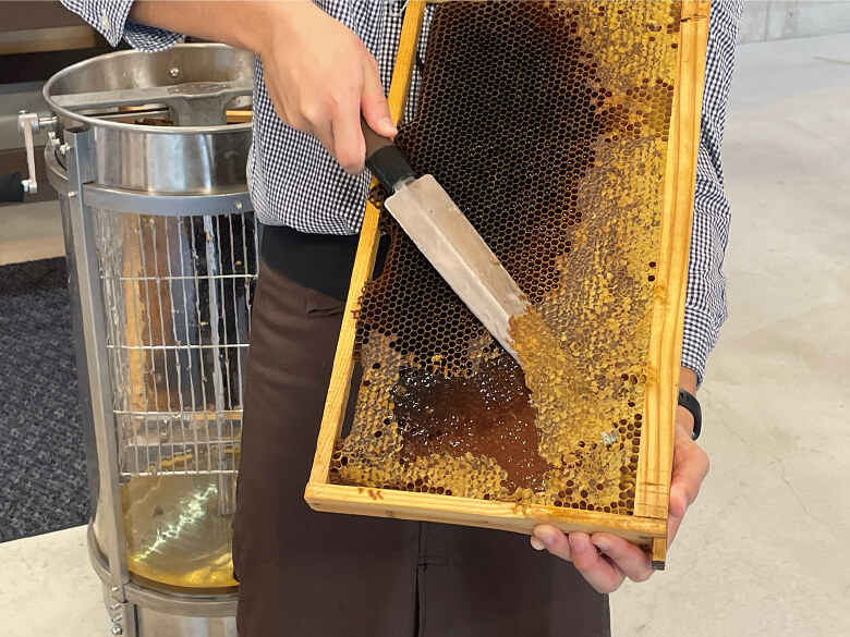 巣枠にたまったハチミツ。表面のフタにあたる部分を切り落とすと中の蜜が出てくるようになる。これを手動の遠心分離機に入れて回転させた後、下部の蛇口をひねるとできあがり。もともと蜂の保存食なので何も加えずそのまま何年も使えるとのこと。