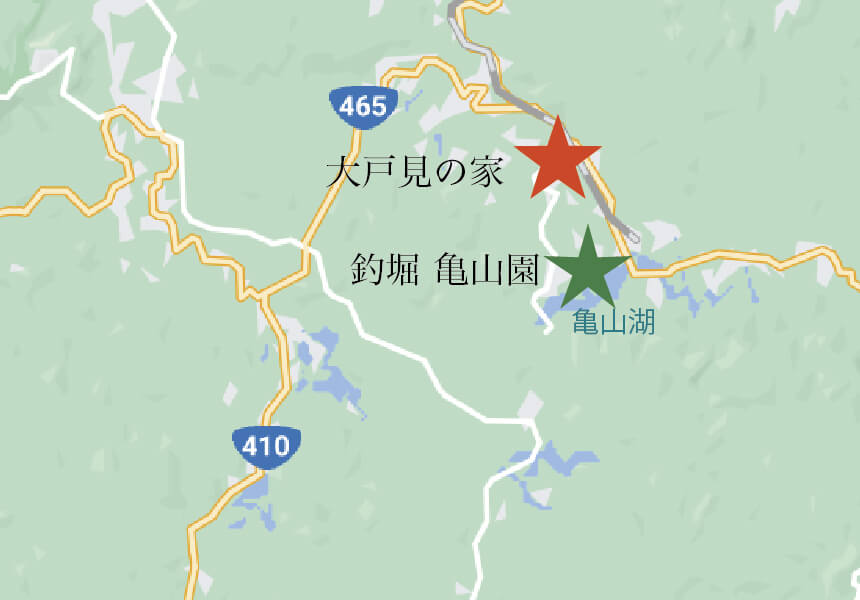 亀山ダムのすぐそばにある釣堀。左にある建物が釣堀の受付で、正面にあるペンションかめやま園が経営している。写真の2面はいずれもコイ池だが、ペンションの裏手にはもう一面ヘラブナ池がある。ブラックバスで有名な亀山湖ではコイもヘラブナも釣れるが、やはり自然の中で釣りをするのは難易度が高く、時間も準備も必要。子ども連れの方はもちろん、ちょっと気軽に釣り遊びが楽しめる広々した釣堀です。