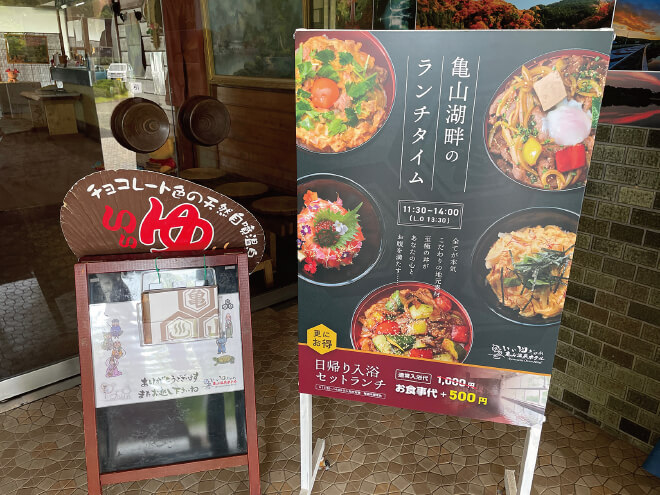 昭和25年創業の老舗温泉ホテル。泉質はナトリウム-塩化物・炭酸水素塩泉。千葉中央部に多い、いわゆる黒湯です。毎分600リットル以上自噴するという湯量豊かな源泉かけながし温泉。養鶏で有名な君津の鶏肉・卵を使った4種類の親子丼ほかランチは11:30〜14:00、日帰り温泉入浴は11:30〜15:00。入浴1000円、ランチ利用の場合は入浴500円に。隠れたおススメはレンタルサイクル。自転車は電動アシストタイプも含め10台。亀山湖畔を気持ちよくサイクリングできます。