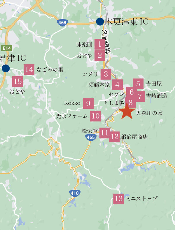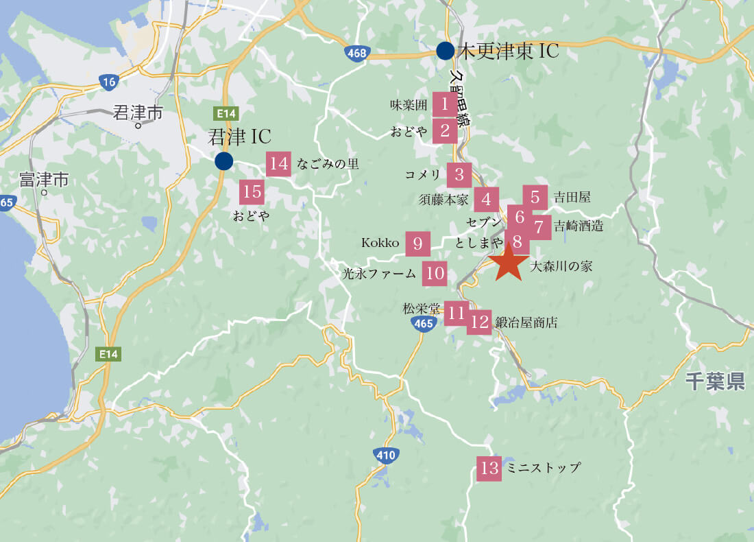 久留里の街は車で5分ですが、やはり現地に向かう際に途中で寄ってから来ていただくのがおすすめです。スーパーマーケット・薬局・100均が一箇所にあるおどや小櫃店が一番便利ですが、農協や養鶏場直営店や酒造メーカーなど地域性豊かなお店もお薦め。
