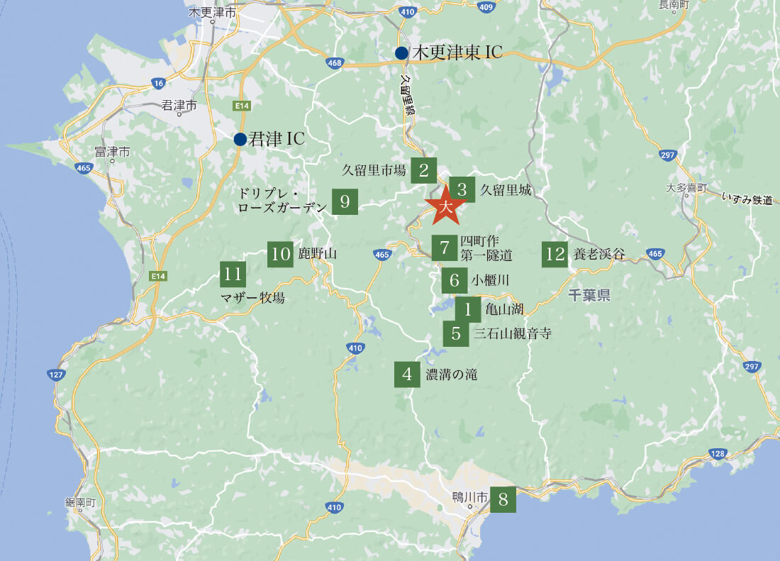 千葉・房総半島南部は低い山々が連なる独特の風景。東山魁夷が描いたことで有名な鹿野山の見晴らしや養老渓谷など静かに景色を楽しむも良し。足を伸ばして鴨川シーワールドやマザー牧場まで出かけても良し。久留里にはお城と資料館、名水と酒造メーカーがあり、おいしい飲食店も豊富。