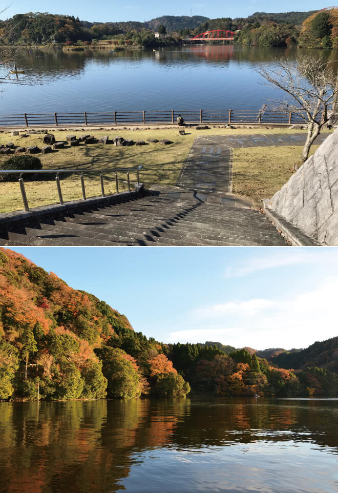 小櫃側上流、千葉県最大のダム湖。サイクリングやハイキング、ポート遊びができます。ブラックバスの釣りも有名で、夏には花火大会、秋にはダム放流見学会も催されるオータムフェスティバルといったイベントも。12月上旬まで紅葉が楽しめ「本州一遅い紅葉」として知られます。また、付近には日帰り入浴もできる温泉施設があり、鮎やヤマメなど川魚や、猪鍋といった料理を楽しむこともできます。