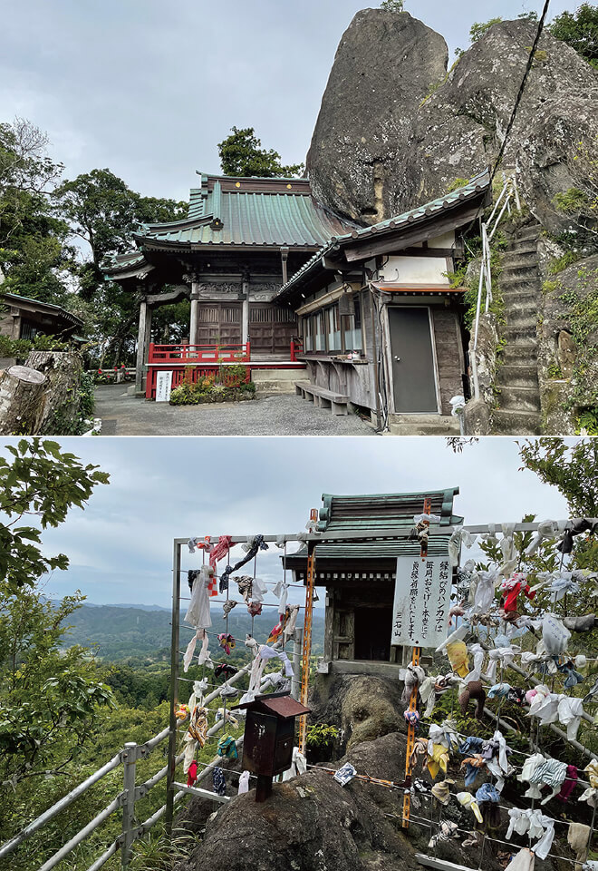 室町時代に覚恵上人がこの山の霊気に感じ入り開山したと伝えられる。山頂に3つの大岩があることから三石山と呼ばれ、本堂はこの岩にくっついて建てられている。さらに岩の間の狭い道を通って縁結びで有名な奥の院へとたどりつく。パワースポットと言われるにふさわしい奇観で行く価値あり。大戸見の家から展望台に隣接する駐車場まで車14分、そこから軽い山登りで500mほどの距離。